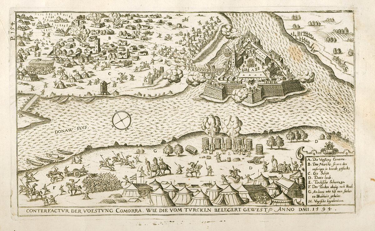 Komárno 1594. In: Ortelius, Hieronymus: Ortelius redivivus et continuatus, Oder Der Ungarischen Kriegs – Empörungen…. Franckfurt am Mayn, 1665, s. 154. snkIB 4073/1-2