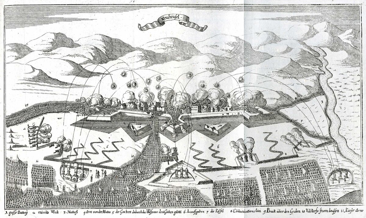 Nové Zámky ( 16.augusta- 25.septembra 1663). In: WAGNER, Johann Christoph: Delineatio provinciarum Pannonie et imperii Turcici in Oriente. Augspurg 1685, s. 162. snkIB 4079.