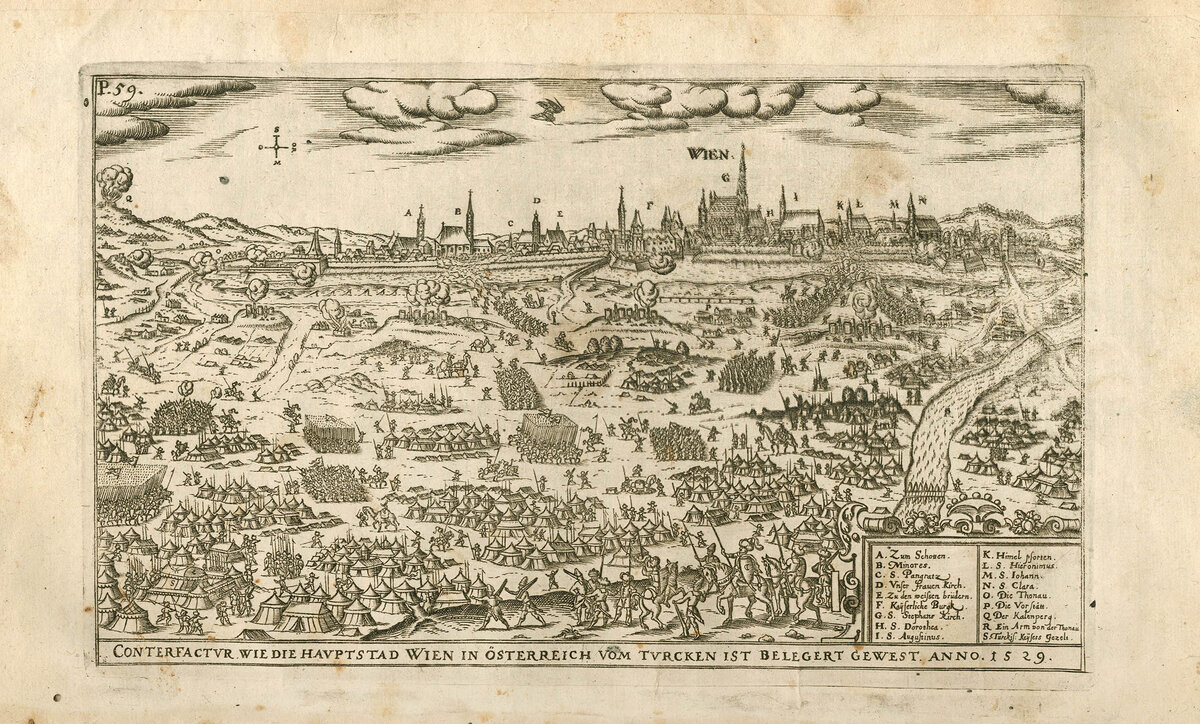 CSM1 -Obliehanie Viedne (25. septembra – 14. októbra 1529) In: Ortelius, Hieronymus: Ortelius redivivus et continuatus, Oder Der Ungarischen Kriegs – Empörungen.... Franckfurt am Mayn, 1665, s. 59. snk IB 4073/1-2