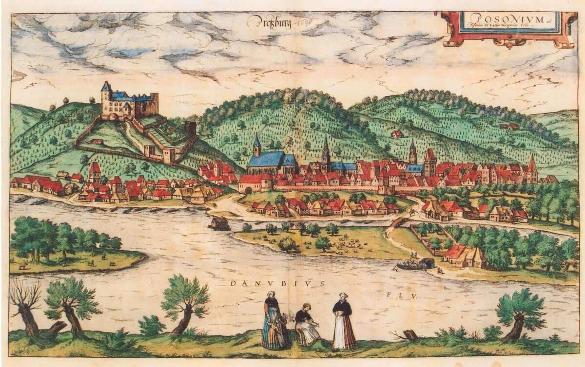 Kolorovaná medirytina Bratislavy z roku 1596.